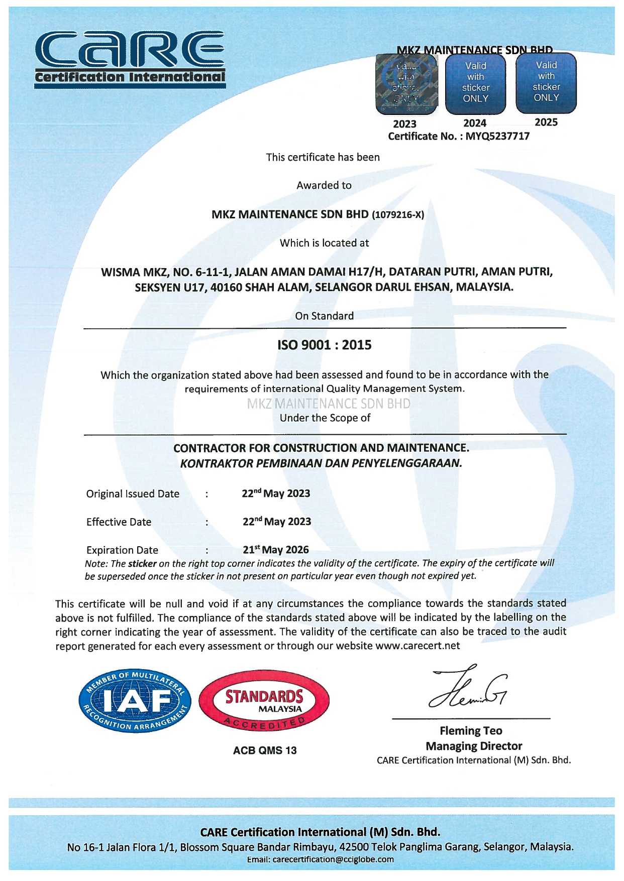 We aim to achieve our mission & vision through total service satisfaction to our customers in terms of service delivery, quality of work & product knowledge. Reducing costs through continuous, effective improvements and utilization of technology in terms of process & systems. MKZ Maintenance Sdn. Bhd. has vast experience in the building and maintenance industry. We strictly adhere to the ethical standards set by the industry.